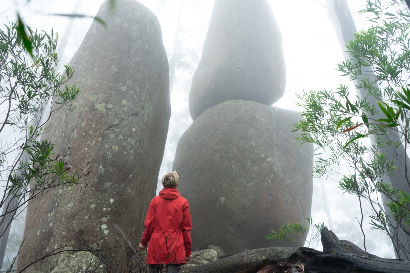 Just near the junction of the 4WD track and the walking track from Tilba Tilba, there are some impressive rock formations that are culturally significant to the local Yuin (Djuwin) people for their healing powers. Yuin people know Gulaga as Mother Mountain. It is an important women’s place, linked to ceremony, childbirth and storytelling. Daramah, the Great Spirit, created the heavens and the earth and all nature, including two people, first a woman, Ngardi, and a man, Tunku. A short and cautious stroll through a boulder garden along the ridge opposite the information board leads to the man and woman boulders, and with a bit of imagination one can identify them both, as well as appreciate the imagery of childbirth among the nearby rock formations. The walk is respectfully done in silence. The access walk from Tilba Tilba takes around an hour; from the top of the 4WD track, about half an hour.